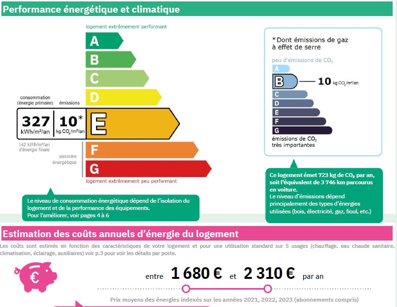 DPE : E (327 kWh/m²/an) GES : B (10kgCO2/m²/an) Prix moyen des énergies compris entre 1680€ et 2310€, indexé sur les années 2021, 2022, 2023